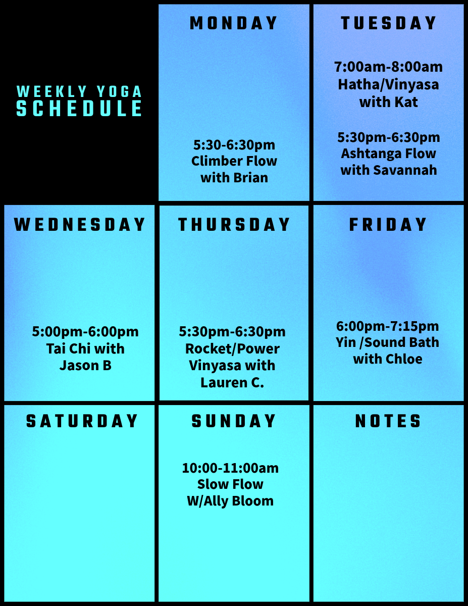 Climbers Power Flow - Vinyasa flow integrating inversions and arm balances. This class emphasizes building core strength and opening the shoulders and back.